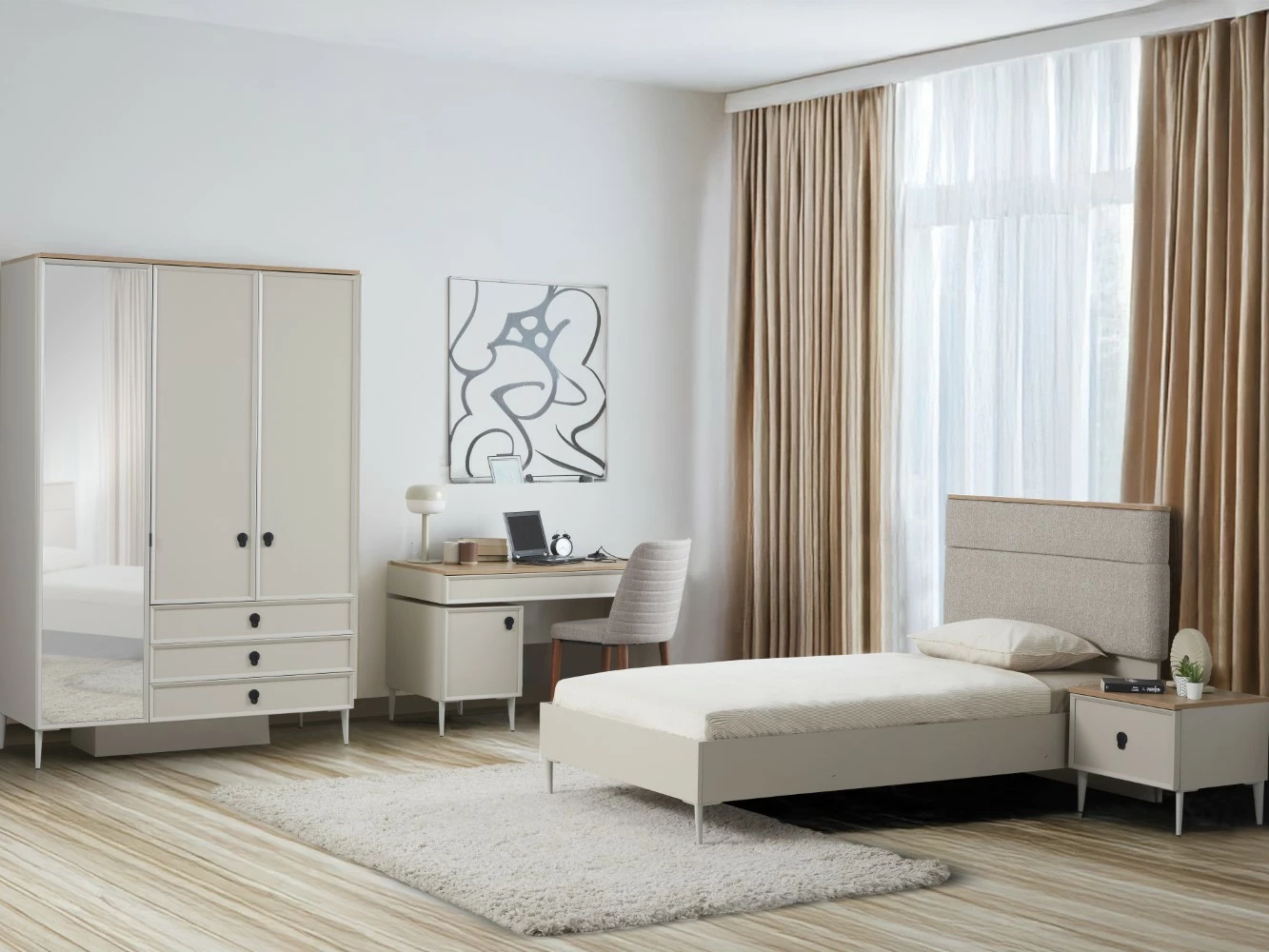Merlin Genç Odası, gençlerin ihtiyaçlarına ve isteklerine özel olarak tasarlanmış, fonksiyonel ve şık bir yaşam alanı sunar. Modern çizgilerle tasarlanan mobilyalar, gençlerin kendilerini rahat ve huzurlu hissetmelerini sağlar. Geniş depolama alanları, düzenli ve organize bir yaşam ortamı oluştururken, ergonomik çalışma alanı, verimli ve keyifli bir çalışma deneyimi sunar.